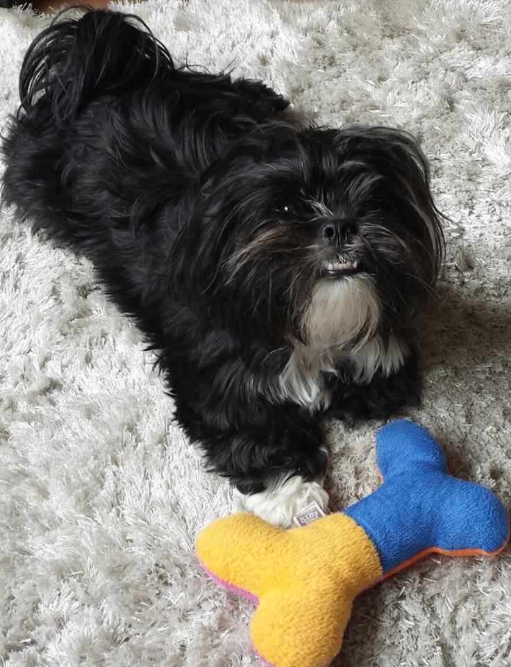 Ayla toda linda exibindo seu ossinho de pelúcia!