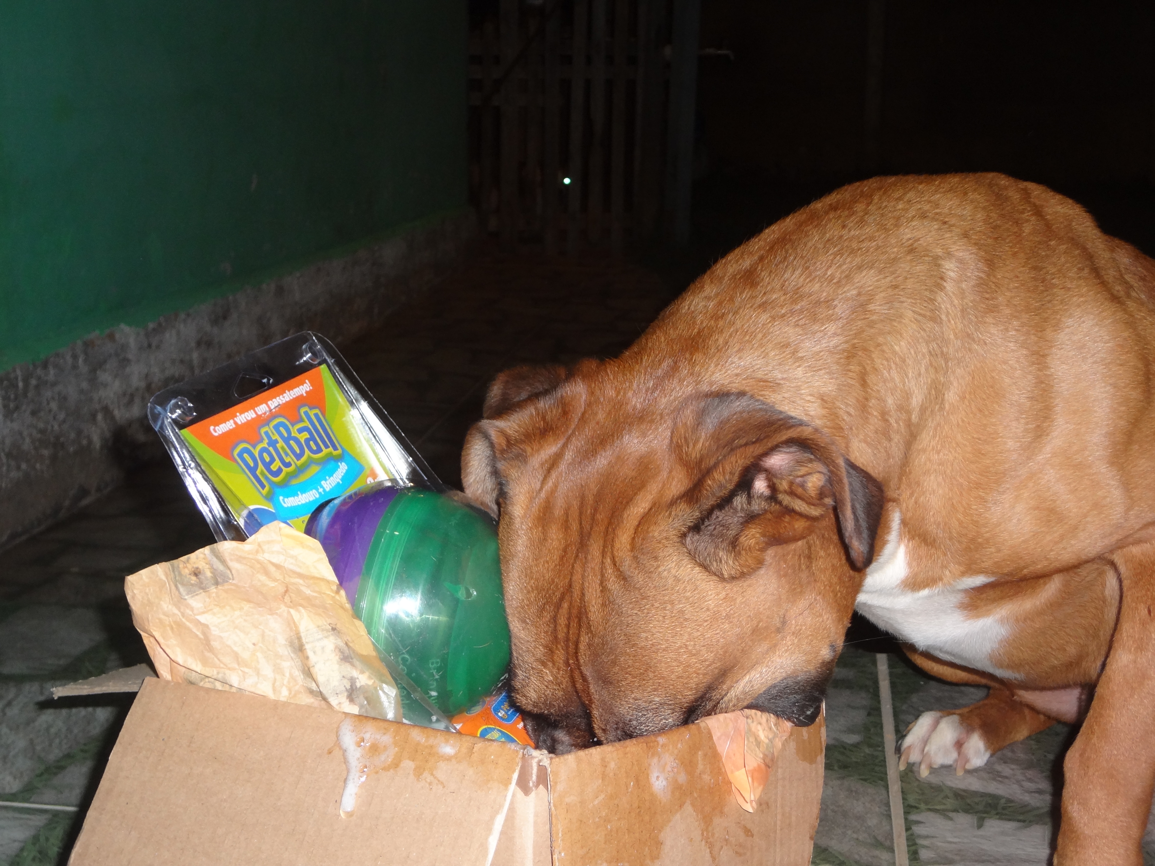 Olha o charmoso Sadan com a sua Maskoto! Segundo sua mamis Bruna, ele ficou super agitado e curioso, foi logo enfiando o focinho na caixinha…rs Sadan adorou a surpresa e amou Maskoto dele!