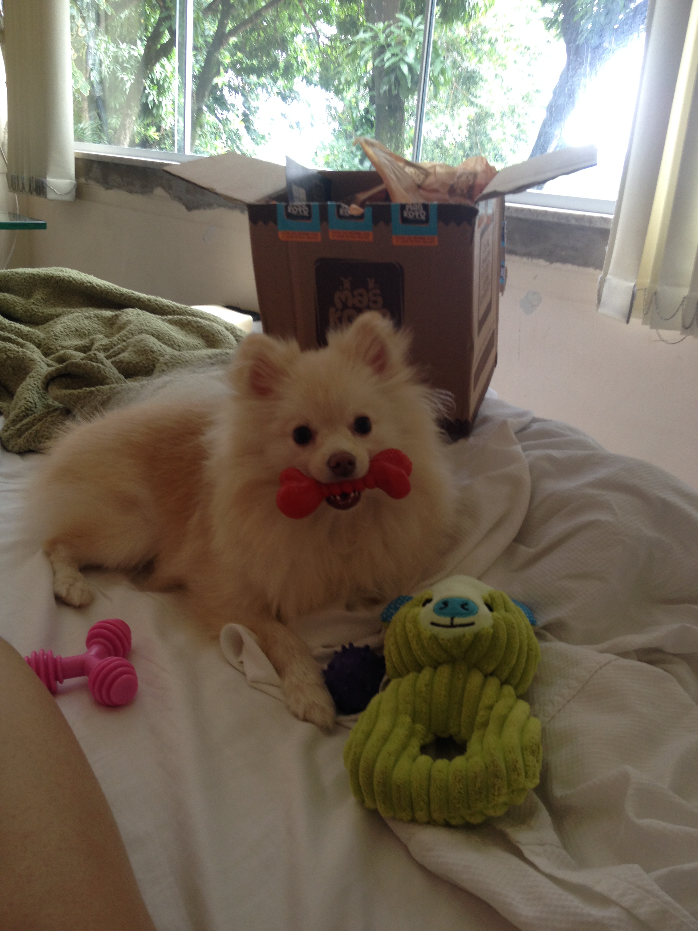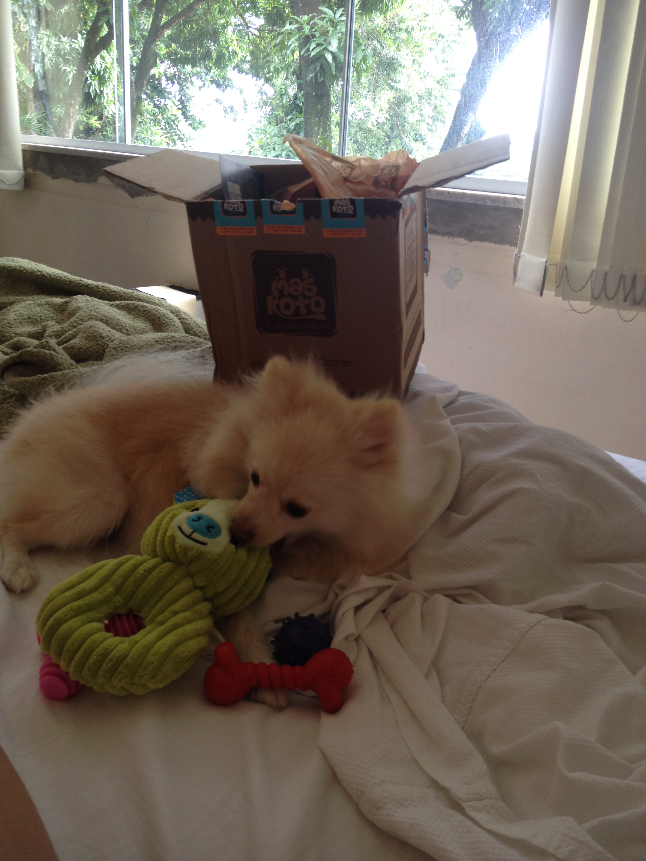 Acho que o Angú (meu Lulu de 1 ano e 3 meses) já sabia que ali tinha surpresa para ele! Desde que abri a caixinha, ele não sabe com qual brinquedo brinca mais. São brinquedos de qualidade, com cheirinho gostoso e são fáceis de lavar! O coelho de pelúcia é resistente, já foi testado pelo Angú e seus dentinhos afiados! E o que achei mais legal, pensando no espírito natalino, veio até panettone próprio para cães! O Angú é supersensível com comida, então dei um pedacinho de panettone para ver se ele iria gostar. E é claro, ele adorou!!! Comeu um inteiro e ainda queria mais! Estou super feliz com a compra e já recomendei para minhas amigas que, assim como eu, adoram mimar seus pets com tudo do bom e do melhor!