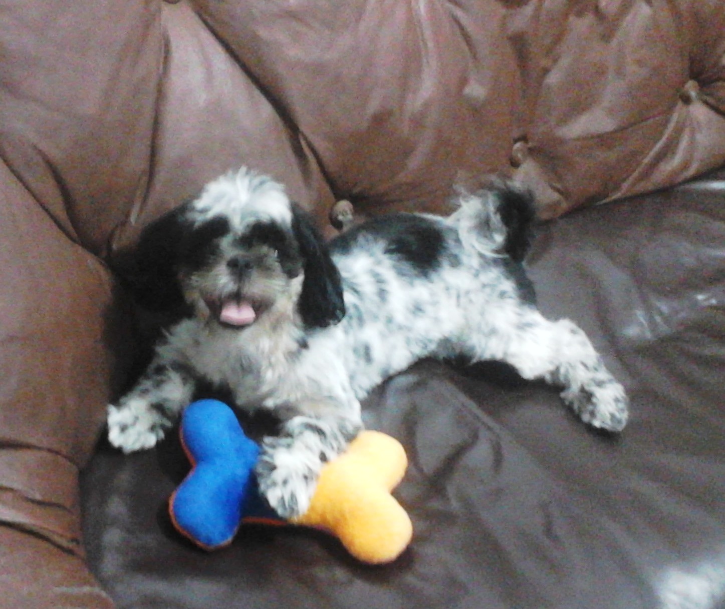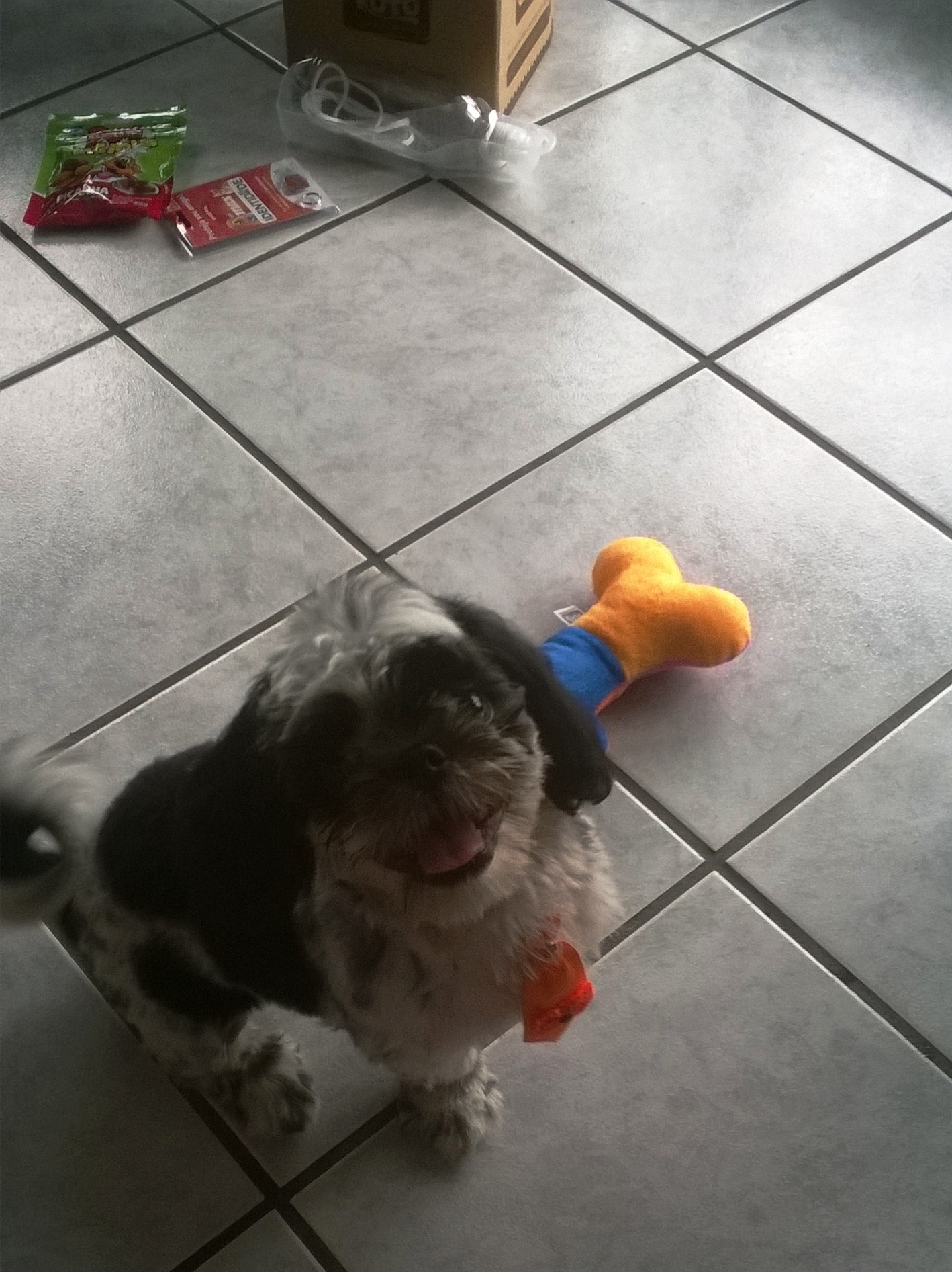 Brincando com o ossinho de pelúcia da Maskoto.