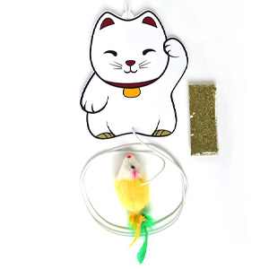 Enfeite de porta (Maneki Nekô) com cordão elástico + ratinho com guizo + catnip.